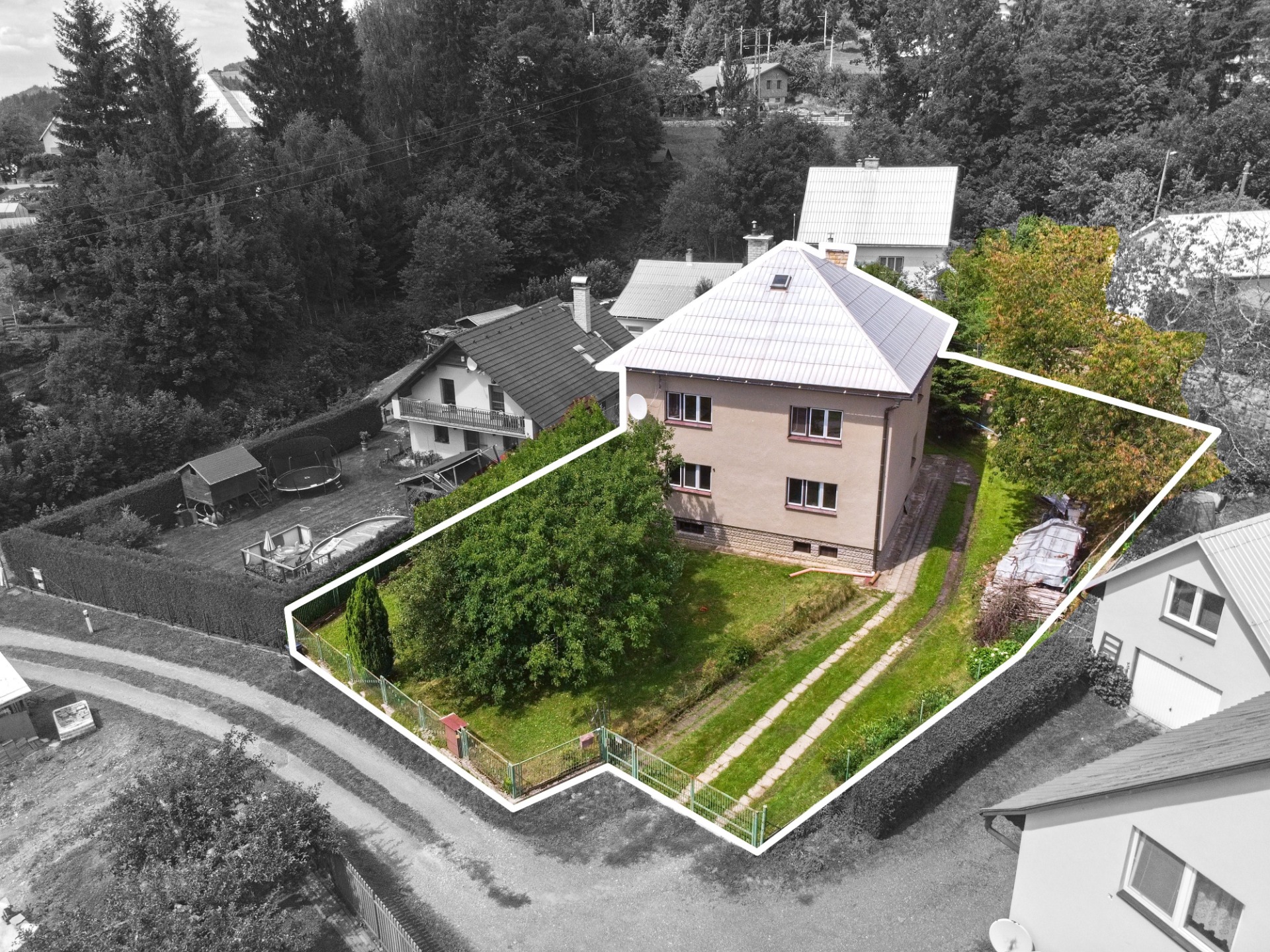 Součástí nabídky je pozemek o rozloze 800 m², na kterém najdete dvě krytá garážová stání, vzrostlé stromy, zahradní krb a dostatek prostoru pro relaxaci nebo rodinné aktivity.